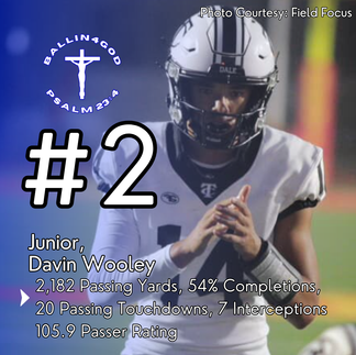 At #2 is junior quarterback from Carbondale Devin Wooley, the only other quarterback to break 2,000 passing yards sitting at 2,182. He has thrown for 20 touchdowns and seven interceptions with a 106 passer rating. The Terriers finished the season 3-6 and missed the playoffs.