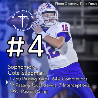 At #4 is sophomore quarterback from Nashville Cole Stiegman. Stiegman passed for 1,760, 19 passing touchdowns, and 7 interceptions with 109 passer rating. The Hornets hit the road in the first round of the playoffs at Flora.